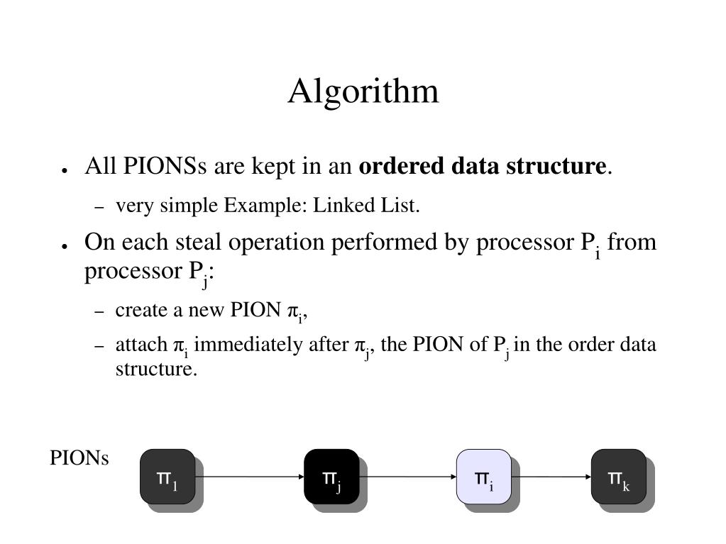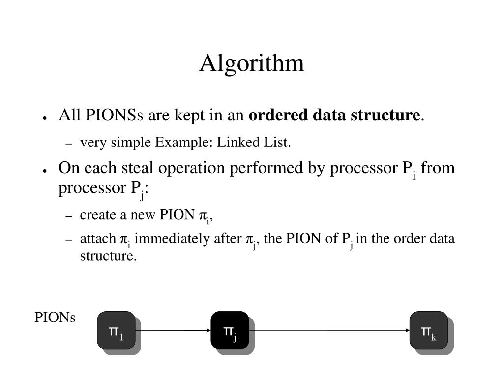 Algorithm • All PIONSs are kept in an ordered data structure. • very simple Example: Linked List. • On each steal operation performed by processor Pi from processor Pj: • create a new PION πi, • attach πi immediately after πj, the PION of Pj in the order data structure. PIONs π1 πj πk πi