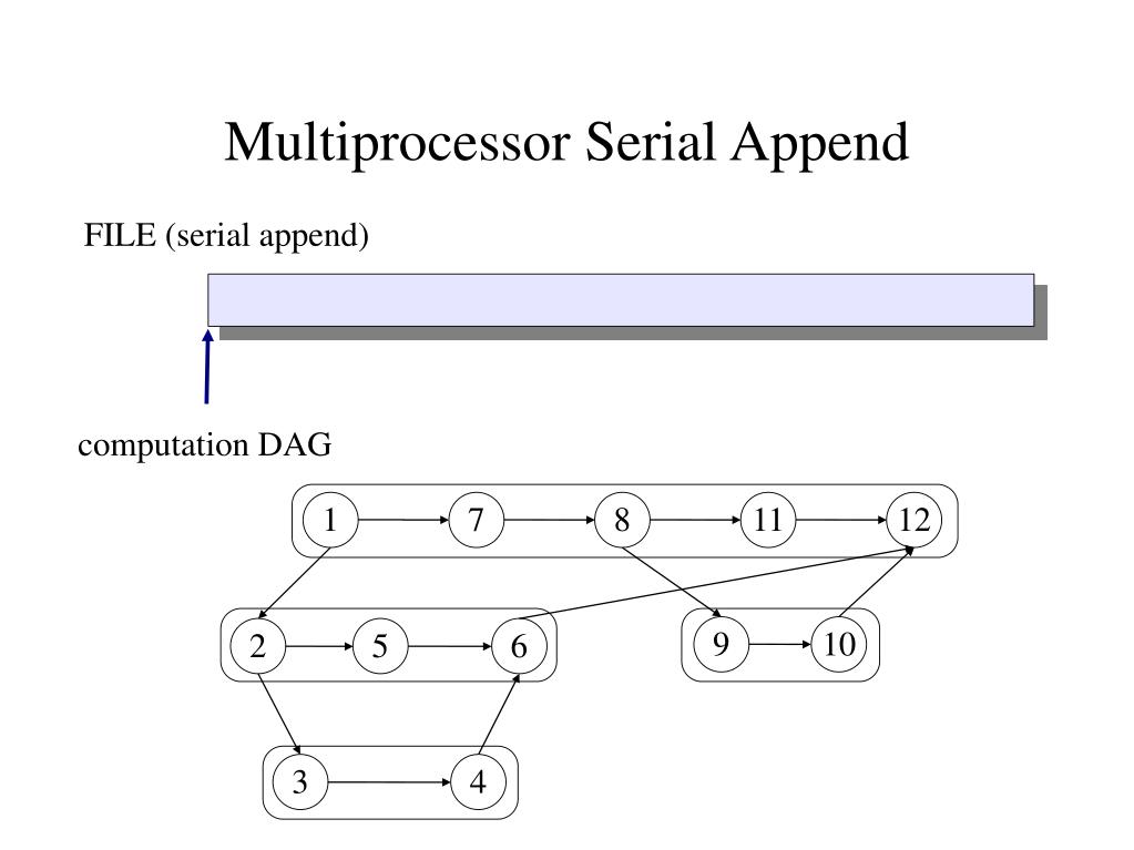 Multiprocessor Serial Append FILE (serial append) 1 2 3 5 7 8 9 computation DAG 1 7 8 11 12 9 10 2 5 6 3 4