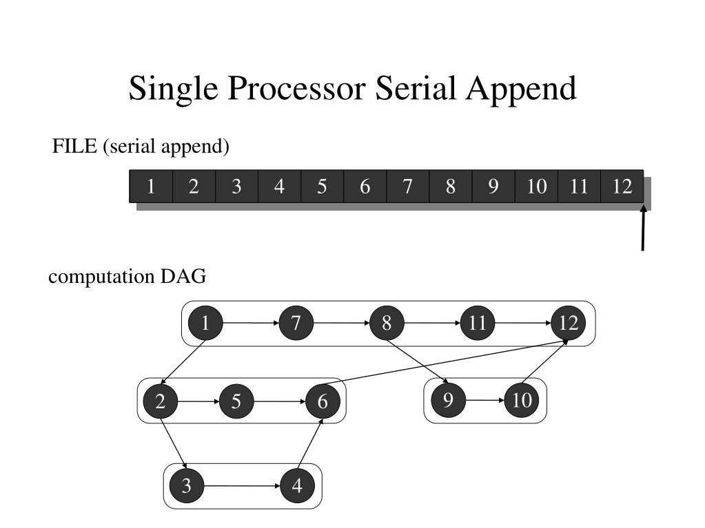 Single Processor Serial Append FILE (serial append) 1 2 3 4 5 6 7 8 9 10 11 12 computation DAG 1 7 8 11 12 9 10 2 5 6 3 4
