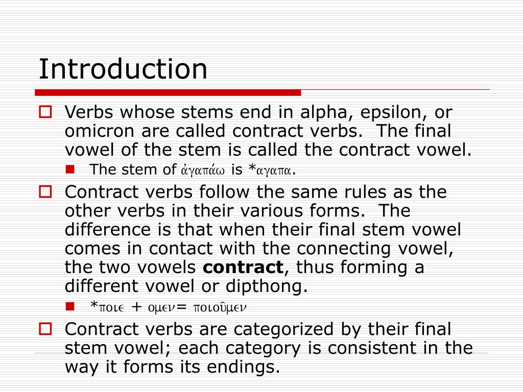 Introduction • Verbs whose stems end in alpha, epsilon, or omicron are called contract verbs. The final vowel of the stem is called the contract vowel. • The stem of avgapa,w is *agapa. • Contract verbs follow the same rules as the other verbs in their various forms. The difference is that when their final stem vowel comes in contact with the connecting vowel, the two vowels contract, thus forming a different vowel or dipthong. • *poie + omen= poiou/men • Contract verbs are categorized by their final stem vowel; each category is consistent in the way it forms its endings.