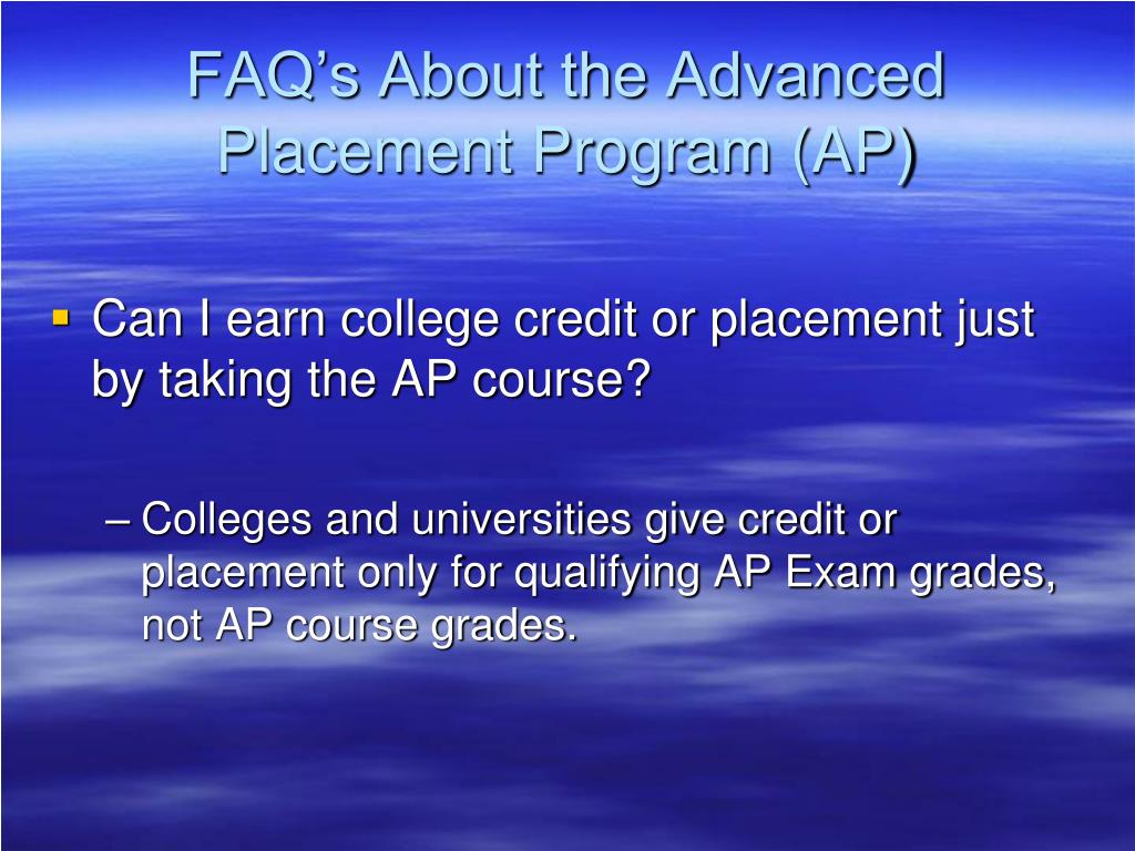 FAQ’s About the Advanced Placement Program (AP) • Can I earn college credit or placement just by taking the AP course? • Colleges and universities give credit or placement only for qualifying AP Exam grades, not AP course grades.