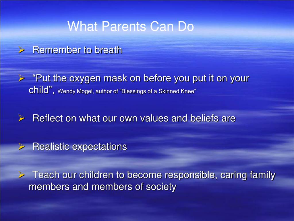 What Parents Can Do • Remember to breath • “Put the oxygen mask on before you put it on your child”, Wendy Mogel, author of “Blessings of a Skinned Knee” • Reflect on what our own values and beliefs are • Realistic expectations • Teach our children to become responsible, caring family members and members of society