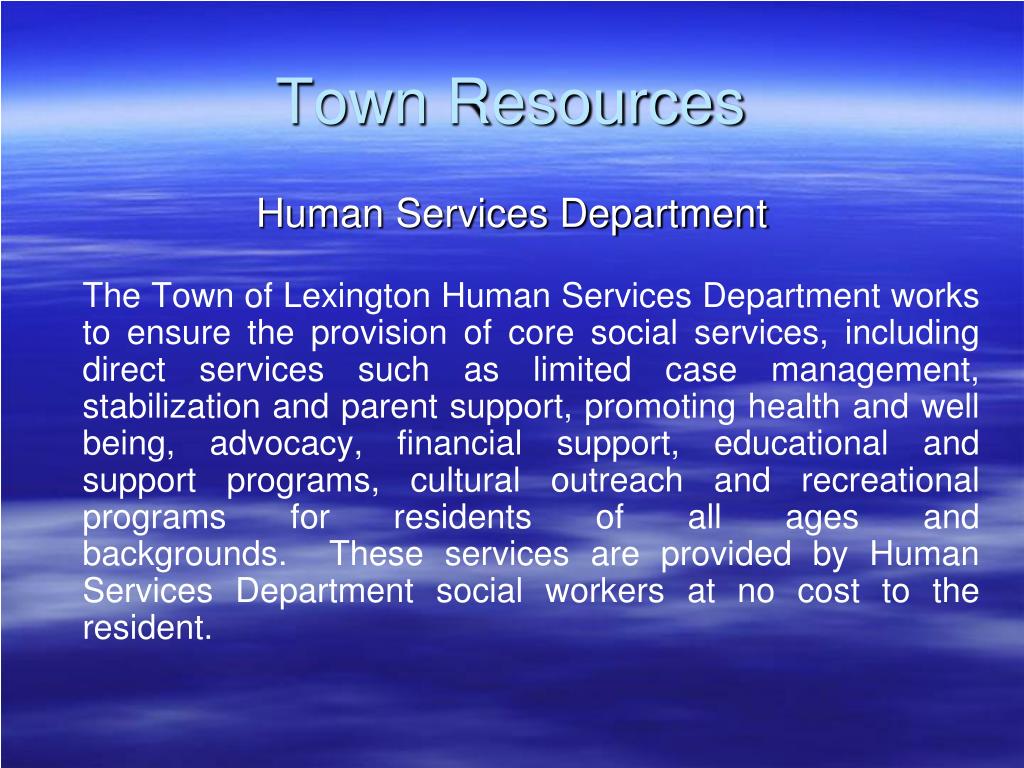 Town Resources Human Services Department The Town of Lexington Human Services Department works to ensure the provision of core social services, including direct services such as limited case management, stabilization and parent support, promoting health and well being, advocacy, financial support, educational and support programs, cultural outreach and recreational programs for residents of all ages and backgrounds. These services are provided by Human Services Department social workers at no cost to the resident.