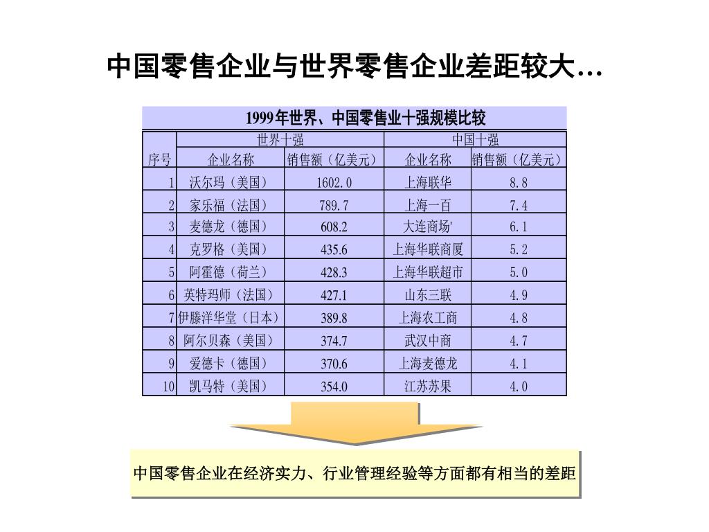 中国零售企业与世界零售企业差距较大… 中国零售企业在经济实力、行业管理经验等方面都有相当的差距