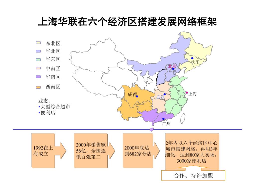 东北区 华北区 华东区 沈阳 北京 中南区 华南区 西南区 成都 上海 武汉 • 业态: • 大型综合超市 • 便利店 广州 上海华联在六个经济区搭建发展网络框架 1992在上海成立 2000年销售额56亿,全国连锁百强第二 2000年底达到682家分店 2年内以六个经济区中心城市搭建网络,再用3年细化,达到80家大卖场,3000家便利店 合作、特许加盟