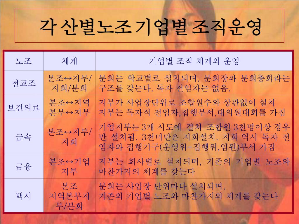 국내산별노조의다양한형태1 IMF구조조정 98~2001년 특징 :조직의 2원화 ▶연맹과 산별노조가 병존 금속산업연맹은 270개 기업단위사업(장), 15만 조합원으로 구성, 이중에서 230개 기업단위(4만명)는 금속노조로 산별 전환, 나머지 40개 기업단위(11만명/대공장노조들)는 미전환