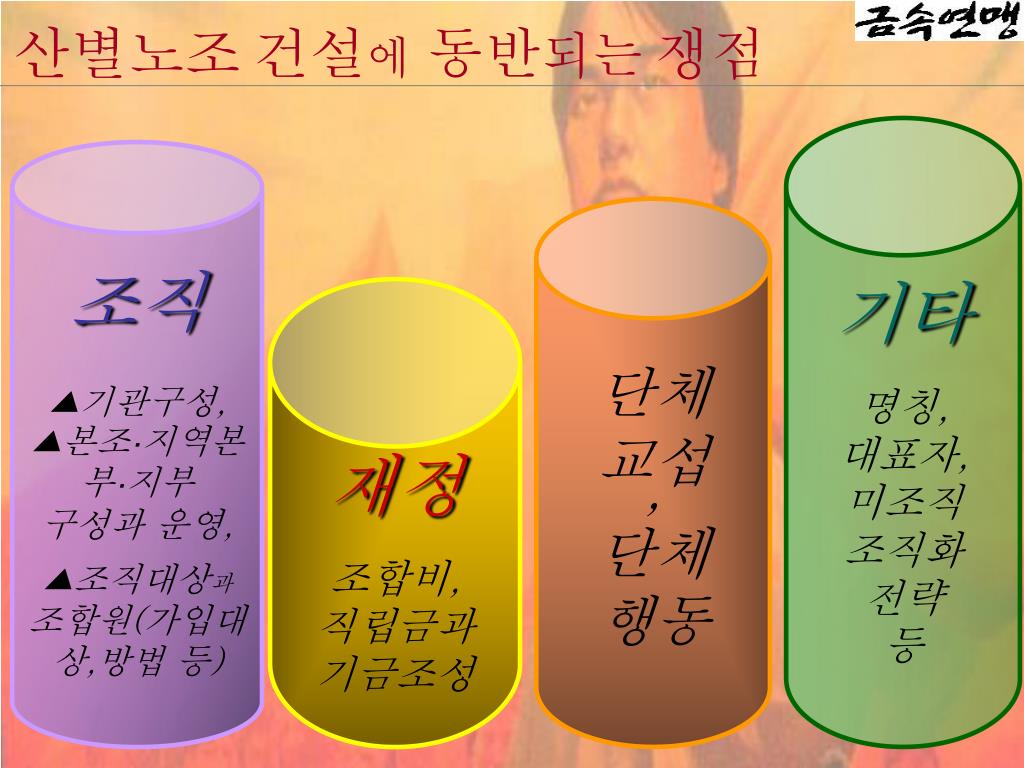 산별노조건설에 동반되는쟁점 기타 명칭, 대표자, 미조직 조직화 전략 등 조직 ▲기관구성, ▲본조·지역본부·지부 구성과 운영, ▲조직대상과 조합원(가입대상,방법 등) 단체 교섭 , 단체 행동 재정 조합비, 직립금과 기금조성