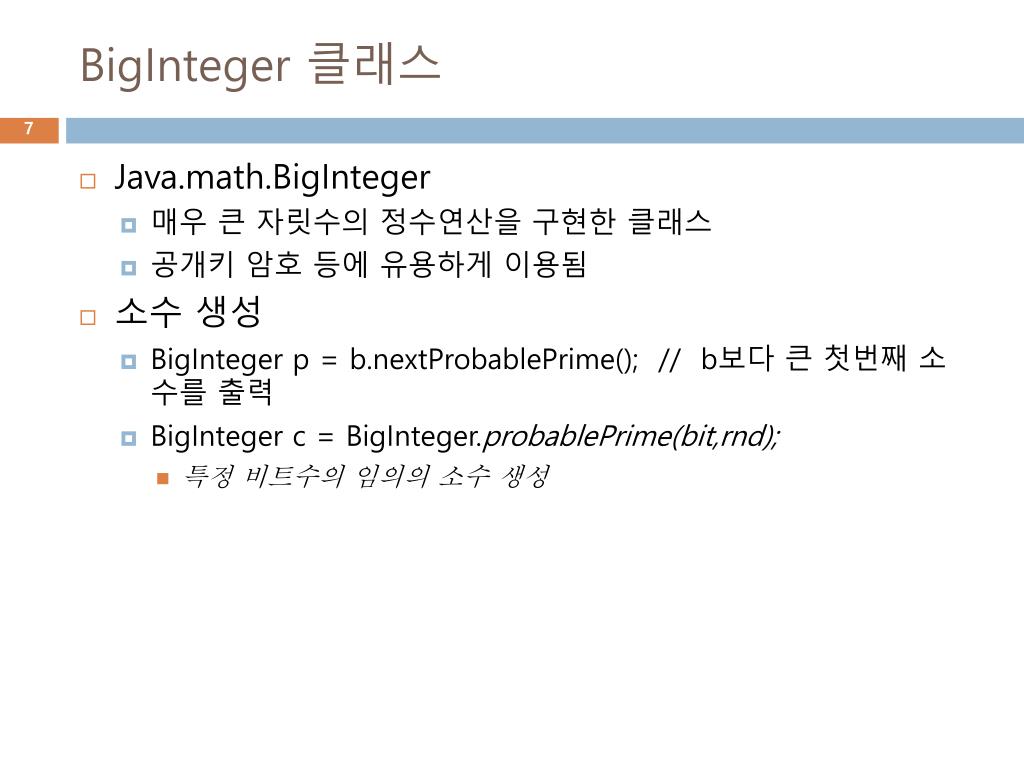 BigInteger클래스 • Java.math.BigInteger • 매우 큰 자릿수의 정수연산을 구현한 클래스 • 공개키 암호 등에 유용하게 이용됨 • 소수 생성 • BigInteger p = b.nextProbablePrime(); // b보다 큰 첫번째 소수를 출력 • BigInteger c = BigInteger.probablePrime(bit,rnd); • 특정 비트수의 임의의 소수 생성