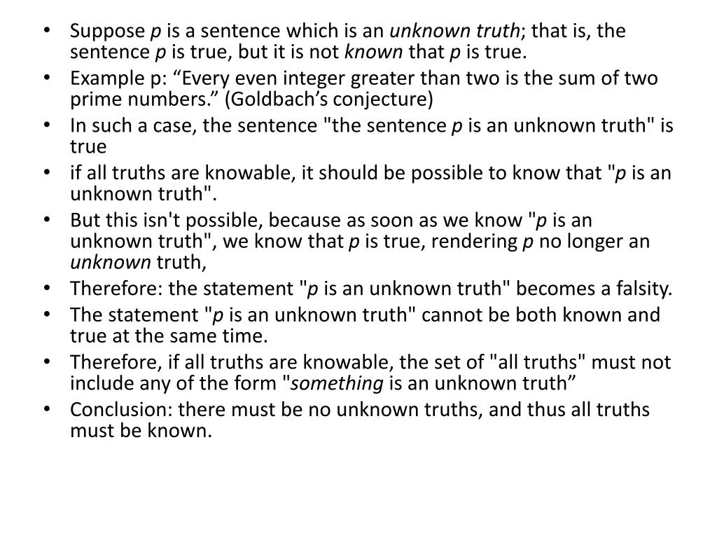 Suppose p is a sentence which is an unknown truth; that is, the sentence p is true, but it is not known that p is true. • Example p: “Every even integer greater than two is the sum of two prime numbers.” (Goldbach’s conjecture) • In such a case, the sentence "the sentence p is an unknown truth" is true • if all truths are knowable, it should be possible to know that "p is an unknown truth". • But this isn't possible, because as soon as we know "p is an unknown truth", we know that p is true, rendering p no longer an unknown truth, • Therefore: the statement "p is an unknown truth" becomes a falsity. • The statement "p is an unknown truth" cannot be both known and true at the same time. • Therefore, if all truths are knowable, the set of "all truths" must not include any of the form "something is an unknown truth” • Conclusion: there must be no unknown truths, and thus all truths must be known.
