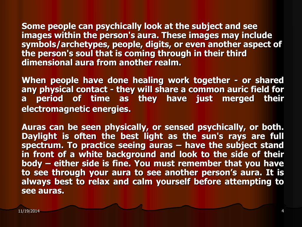 Some people can psychically look at the subject and see images within the person's aura. These images may include symbols/archetypes, people, digits, or even another aspect of the person's soul that is coming through in their third dimensional aura from another realm. When people have done healing work together - or shared any physical contact - they will share a common auric field for a period of time as they have just merged their electromagnetic energies. Auras can be seen physically, or sensed psychically, or both. Daylight is often the best light as the sun's rays are full spectrum. To practice seeing auras – have the subject stand in front of a white background and look to the side of their body – either side is fine. You must remember that you have to see through your aura to see another person’s aura. It is always best to relax and calm yourself before attempting to see auras.