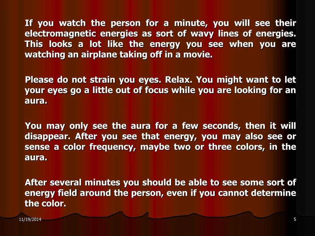 If you watch the person for a minute, you will see their electromagnetic energies as sort of wavy lines of energies. This looks a lot like the energy you see when you are watching an airplane taking off in a movie. Please do not strain you eyes. Relax. You might want to let your eyes go a little out of focus while you are looking for an aura. You may only see the aura for a few seconds, then it will disappear. After you see that energy, you may also see or sense a color frequency, maybe two or three colors, in the aura. After several minutes you should be able to see some sort of energy field around the person, even if you cannot determine the color.