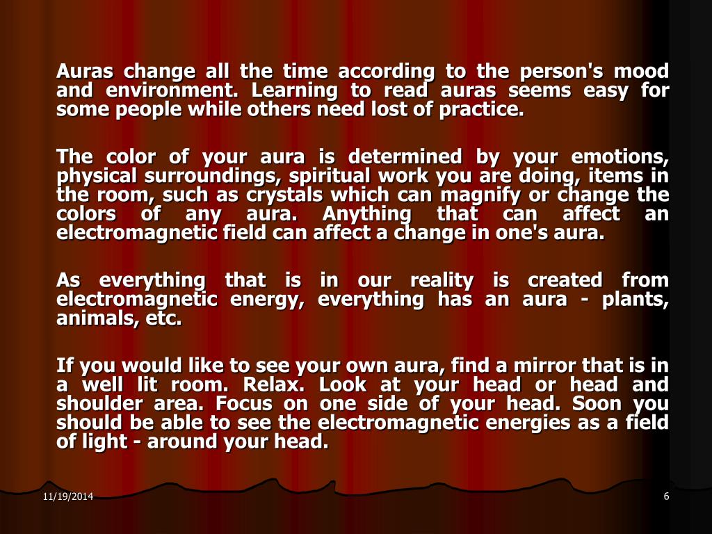 Auras change all the time according to the person's mood and environment. Learning to read auras seems easy for some people while others need lost of practice. The color of your aura is determined by your emotions, physical surroundings, spiritual work you are doing, items in the room, such as crystals which can magnify or change the colors of any aura. Anything that can affect an electromagnetic field can affect a change in one's aura. As everything that is in our reality is created from electromagnetic energy, everything has an aura - plants, animals, etc. If you would like to see your own aura, find a mirror that is in a well lit room. Relax. Look at your head or head and shoulder area. Focus on one side of your head. Soon you should be able to see the electromagnetic energies as a field of light - around your head.
