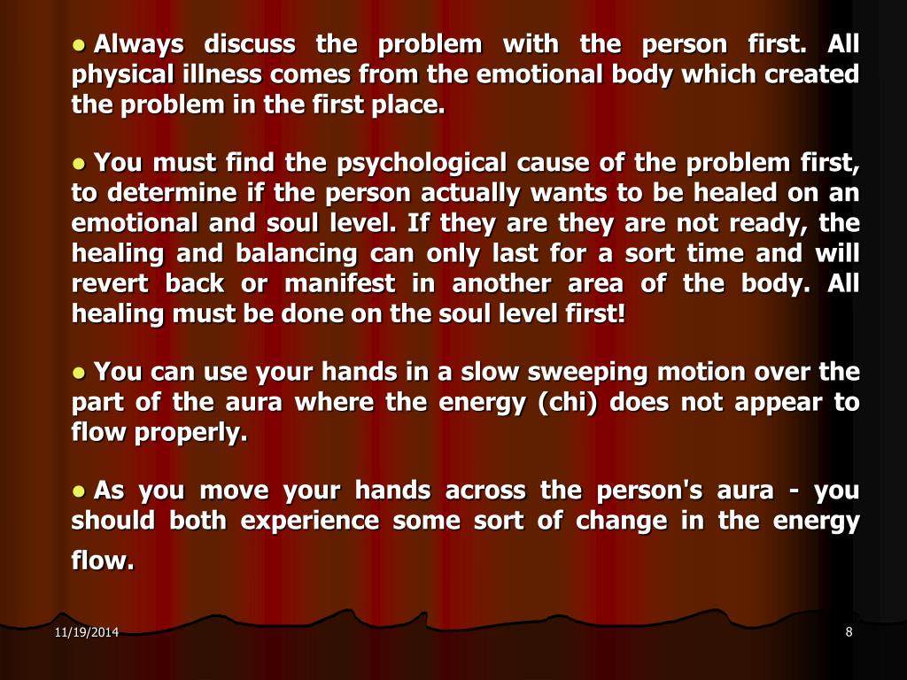 Always discuss the problem with the person first. All physical illness comes from the emotional body which created the problem in the first place. • You must find the psychological cause of the problem first, to determine if the person actually wants to be healed on an emotional and soul level. If they are they are not ready, the healing and balancing can only last for a sort time and will revert back or manifest in another area of the body. All healing must be done on the soul level first! • You can use your hands in a slow sweeping motion over the part of the aura where the energy (chi) does not appear to flow properly. • As you move your hands across the person's aura - you should both experience some sort of change in the energy flow.