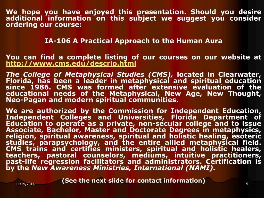 We hope you have enjoyed this presentation. Should you desire additional information on this subject we suggest you consider ordering our course: IA-106 A Practical Approach to the Human Aura You can find a complete listing of our courses on our website at http://www.cms.edu/descrip.html The College of Metaphysical Studies (CMS), located in Clearwater, Florida, has been a leader in metaphysical and spiritual education since 1986. CMS was formed after extensive evaluation of the educational needs of the Metaphysical, New Age, New Thought, Neo-Pagan and modern spiritual communities. We are authorized by the Commission for Independent Education, Independent Colleges and Universities, Florida Department of Education to operate as a private, non-secular college and to issue Associate, Bachelor, Master and Doctorate Degrees in metaphysics, religion, spiritual awareness, spiritual and holistic healing, esoteric studies, parapsychology, and the entire allied metaphysical field. CMS trains and certifies ministers, spiritual and holistic healers, teachers, pastoral counselors, mediums, intuitive practitioners, past-life regression facilitators and administrators. Certification is by the New Awareness Ministries, International (NAMI). (See the next slide for contact information)