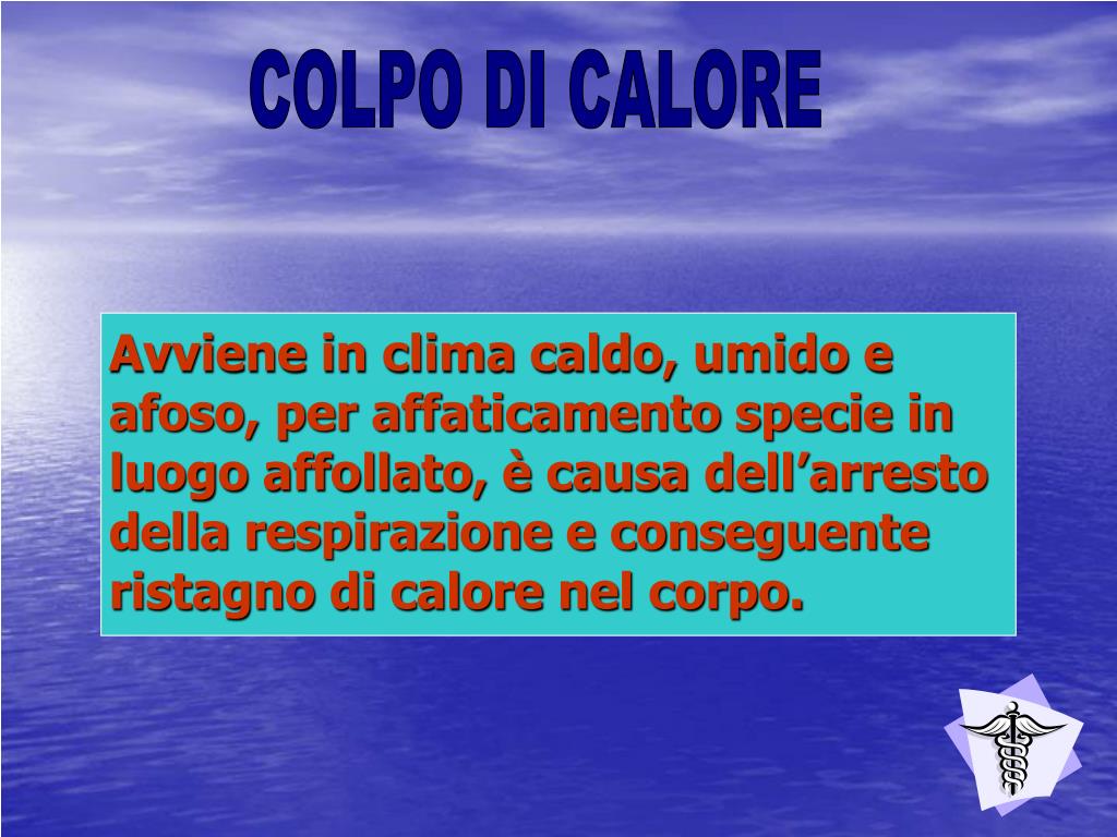 COLPO DI CALORE Avviene in clima caldo, umido e afoso, per affaticamento specie in luogo affollato, è causa dell’arresto della respirazione e conseguente ristagno di calore nel corpo.