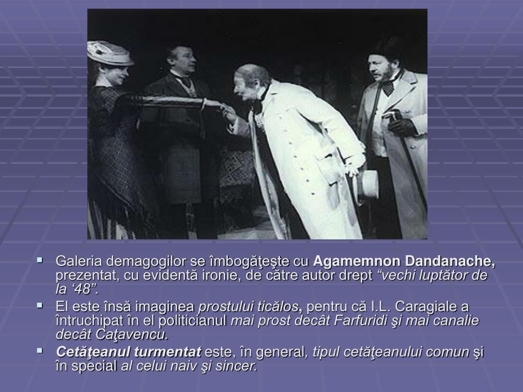 Galeria demagogilor se îmbogăţeşte cu Agamemnon Dandanache, prezentat, cu evidentă ironie, de către autor drept “vechi luptător de la ‘48”. • El este însă imaginea prostului ticălos, pentru că I.L. Caragiale a întruchipat în el politicianul mai prost decât Farfuridi şi mai canalie decât Caţavencu. • Cetăţeanul turmentat este, în general, tipul cetăţeanului comun şi în special al celui naiv şi sincer.