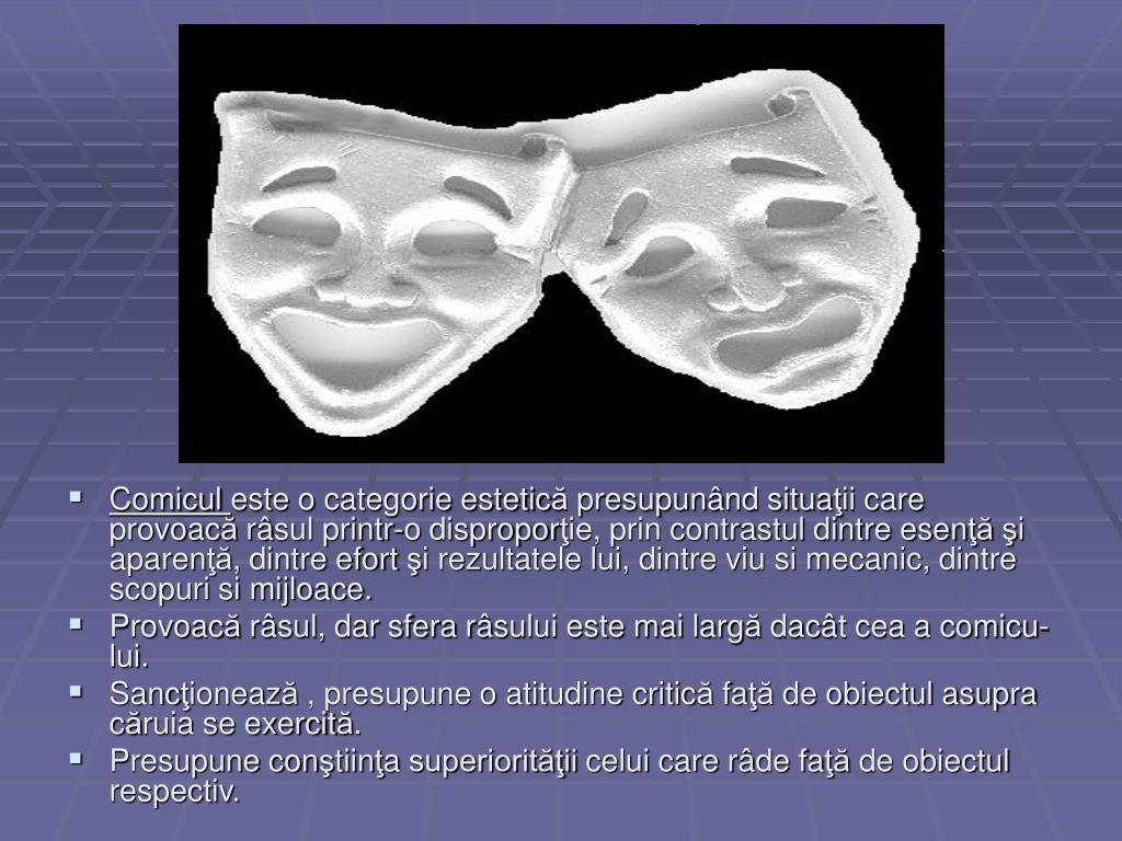 Comiculeste o categorie estetică presupunând situaţii care provoacă râsul printr-o disproporţie, prin contrastul dintre esenţăşi aparenţă, dintre efort şi rezultatele lui, dintre viu si mecanic, dintre scopuri si mijloace. • Provoacă râsul, dar sfera râsului este mai largă dacât cea a comicu-lui. • Sancţionează , presupune o atitudine critică faţă de obiectul asupra căruia se exercită. • Presupune conştiinţa superiorităţii celui care râde faţă de obiectul respectiv.