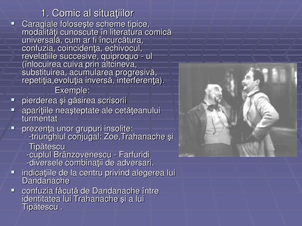 1. Comic al situaţiilor • Caragiale foloseşte scheme tipice, modalităţi cunoscute în literatura comică universală, cum ar fi încurcătura, confuzia, coincidenţa, echivocul, revelatiile succesive, quiproquo - ul (înlocuirea cuiva prin altcineva, substituirea, acumularea progresivă, repetiţia,evoluţia inversă, interferenţa). Exemple: • pierderea şi găsirea scrisorii • apariţiile neaşteptate ale cetăţeanului turmentat • prezenţa unor grupuri insolite:-triunghiul conjugal:Zoe,Trahanache şi Tipătescu-cuplul Brânzovenescu - Farfuridi-diversele combinaţii de adversari. • indicaţiile de la centru privind alegerea lui Dandanache • confuzia făcută de Dandanache între identitatea lui Trahanache şi a lui Tipătescu .