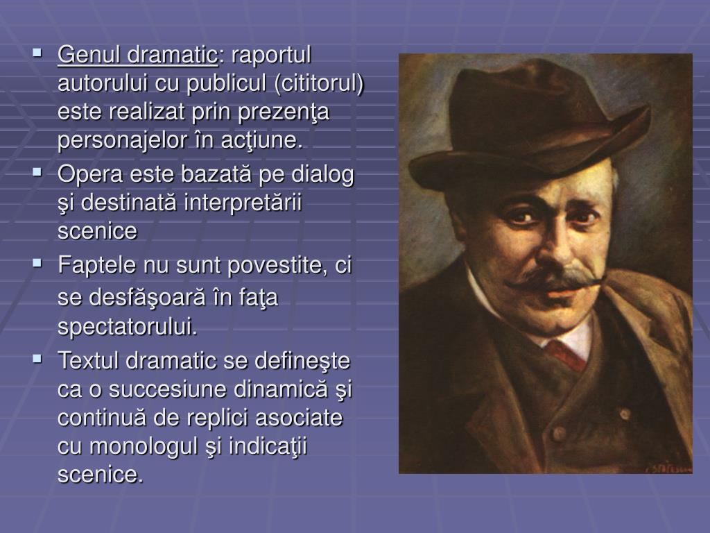 Genul dramatic: raportul autorului cu publicul (cititorul) este realizat prin prezenţa personajelor în acţiune. • Opera este bazată pe dialog şi destinată interpretării scenice • Faptele nu sunt povestite, ci se desfăşoarăîn faţaspectatorului. • Textul dramatic se defineşte ca o succesiune dinamicăşi continuă de replici asociate cu monologul şi indicaţii scenice.