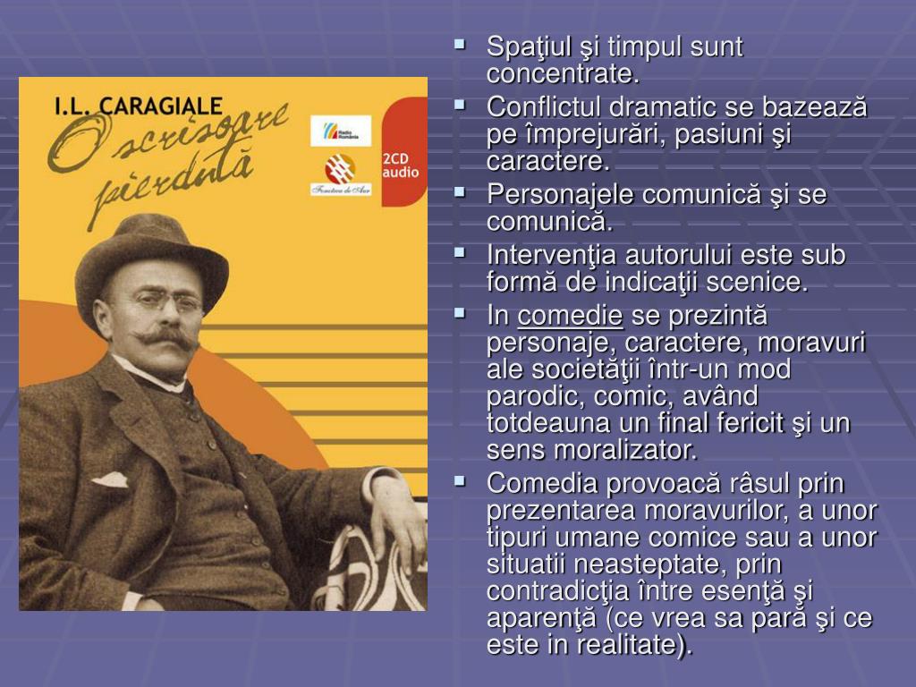 O scrisoare pierdută. de Ion Luca Caragiale. Conf. univ. dr. Mihai BRĂSLAŞU. Genul dramatic : raportul autorului cu publicul ( cititorul ) este realizat prin prezen ţ a personajelor î n ac ţ iune. O pera este bazat ă pe dialog ş i destinat ă interpret ă rii scenice