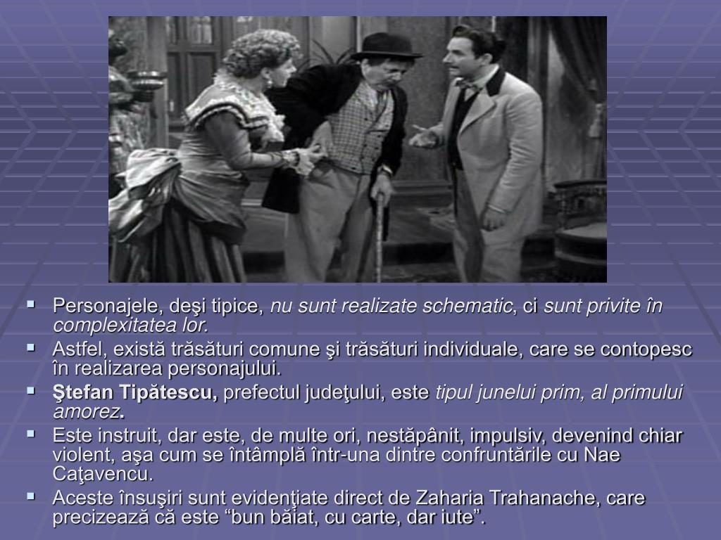 Personajele, deşi tipice, nu sunt realizate schematic, ci sunt privite în complexitatea lor. • Astfel, există trăsături comune şi trăsături individuale, care se contopesc în realizarea personajului. • Ştefan Tipătescu, prefectul judeţului, este tipul junelui prim, al primului amorez. • Este instruit, dar este, de multe ori, nestăpânit, impulsiv, devenind chiar violent, aşa cum se întâmplă într-una dintre confruntările cu Nae Caţavencu. • Aceste însuşiri sunt evidenţiate direct de Zaharia Trahanache, care precizează că este “bun băiat, cu carte, dar iute”.