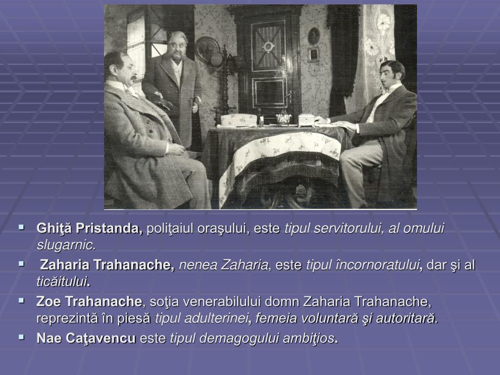 Ghiţă Pristanda, poliţaiul oraşului, este tipul servitorului, al omului slugarnic. • Zaharia Trahanache, nenea Zaharia, estetipul încornoratului, dar şi alticăitului. • Zoe Trahanache, soţia venerabilului domn Zaharia Trahanache, reprezintă în piesă tipul adulterinei, femeia voluntară şi autoritară. • Nae Caţavencu este tipul demagogului ambiţios.