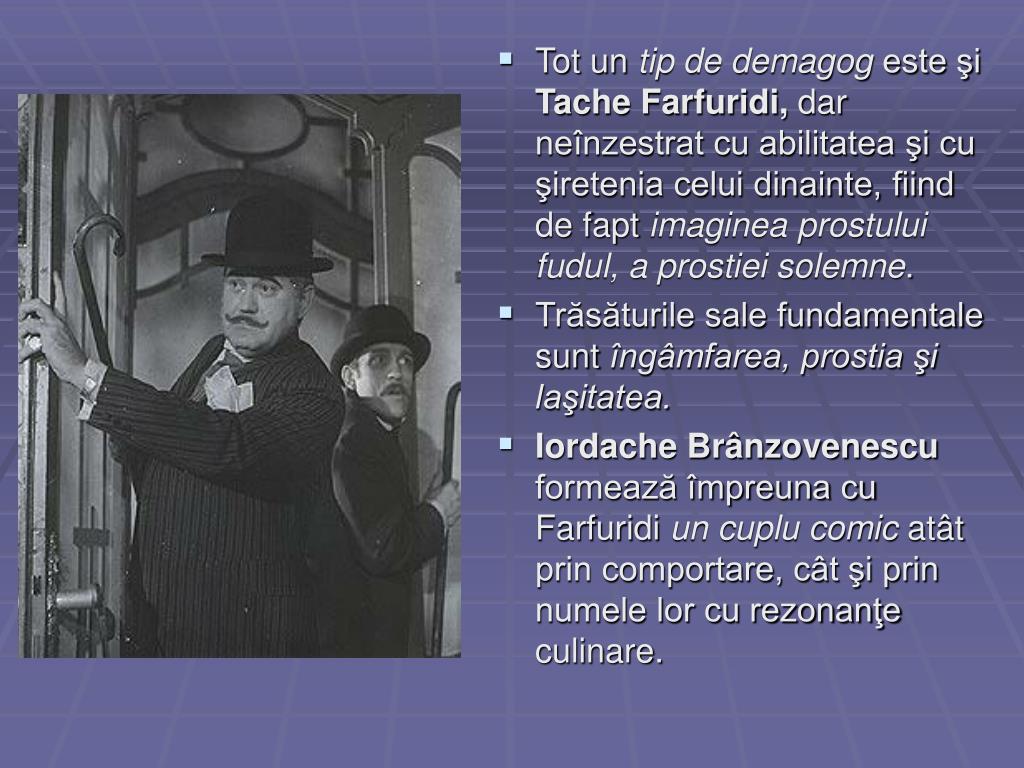 Tot un tip de demagog este şi Tache Farfuridi, dar neînzestrat cu abilitatea şi cu şiretenia celui dinainte, fiind de fapt imaginea prostului fudul, a prostiei solemne. • Trăsăturile sale fundamentale sunt îngâmfarea, prostia şi laşitatea. • Iordache Brânzovenescu formează împreuna cu Farfuridi un cuplu comic atât prin comportare, cât şi prin numele lor cu rezonanţe culinare.