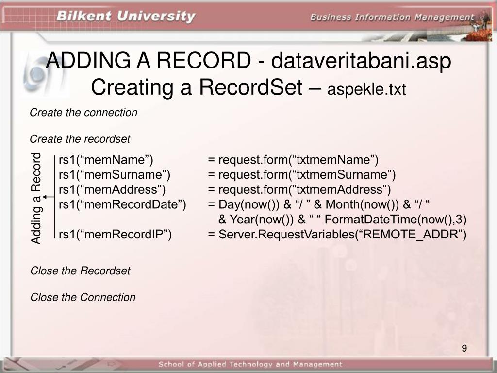ADDING A RECORD - dataveritabani.asp Creating a RecordSet – aspekle.txt Create the connection Create the recordset rs1(“memName”) = request.form(“txtmemName”) rs1(“memSurname”) = request.form(“txtmemSurname”) rs1(“memAddress”) = request.form(“txtmemAddress”) rs1(“memRecordDate”) = Day(now()) & “/ ” & Month(now()) & “/ “ & Year(now()) & “ “ FormatDateTime(now(),3) rs1(“memRecordIP”) = Server.RequestVariables(“REMOTE_ADDR”) Adding a Record Close the Recordset Close the Connection