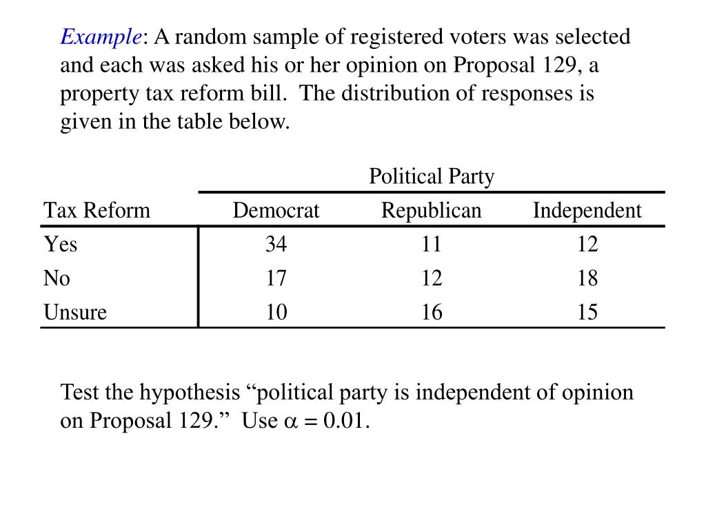 Example: A random sample of registered voters was selected and each was asked his or her opinion on Proposal 129, a property tax reform bill. The distribution of responses is given in the table below. Test the hypothesis “political party is independent of opinion on Proposal 129.” Use a = 0.01.