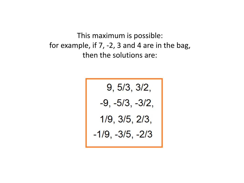 This maximum is possible: for example, if 7, -2, 3 and 4 are in the bag, then the solutions are: