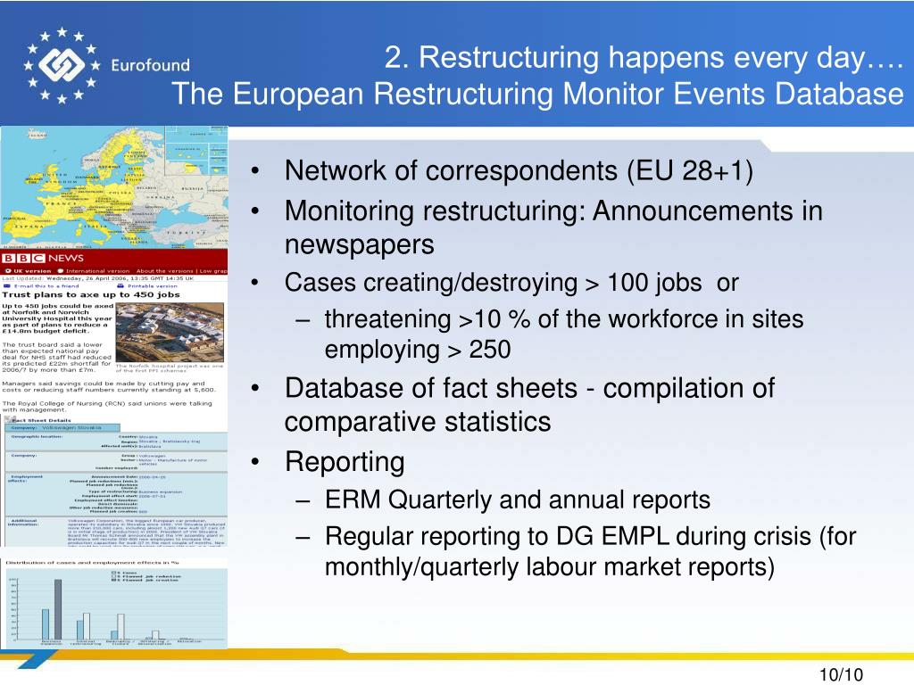 2. Restructuring happens every day…. The European Restructuring Monitor Events Database • Network of correspondents (EU 28+1) • Monitoring restructuring: Announcements in newspapers • Cases creating/destroying > 100 jobs or • threatening >10 % of the workforce in sites employing > 250 • Database of fact sheets - compilation of comparative statistics • Reporting • ERM Quarterly and annual reports • Regular reporting to DG EMPL during crisis (for monthly/quarterly labour market reports)