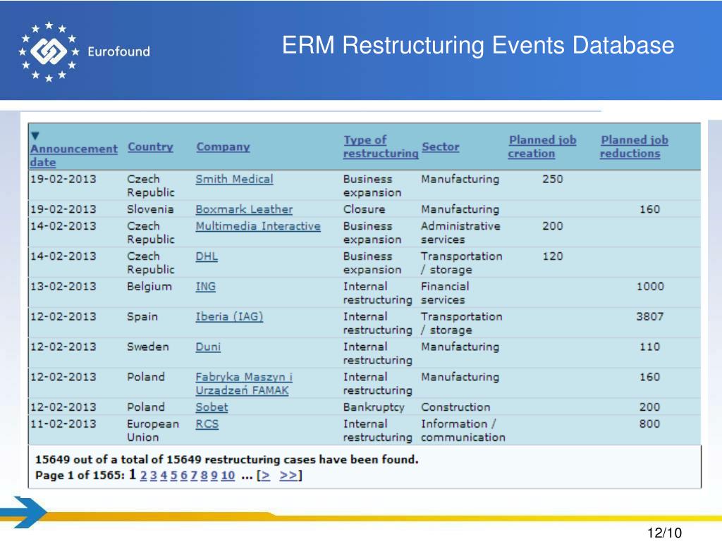 ERM annualreports • (2013 “Ten years of ERM” – special on offshoring) • 2012: After restructuring: labour markets, working conditions and life satisfaction • 2011: Public instruments to support restructuring in Europe • 2010: Extending flexicurity - The potential of short-time working schemes • 2009: Restructuring in recession • 2008: More and better jobs - Patterns of employment expansion in Europe • 2007: Restructuring and employment in the EU: The impact of globalisation • 2006: Restructuring and employment in the EU: Concepts, measurement and evidence