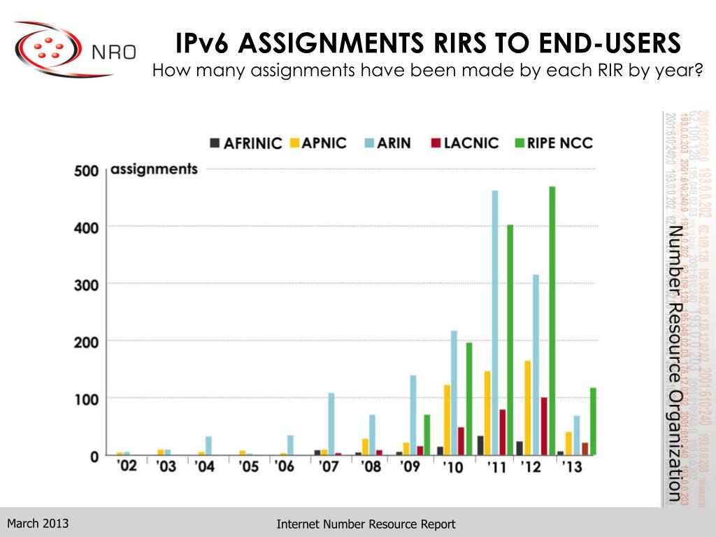 IPv6 ASSIGNMENTS (RIRs TO END-USERS) How many total assignments have been made by each RIR?(Jan 2002 – Mar 2013) Internet Number Resource Report