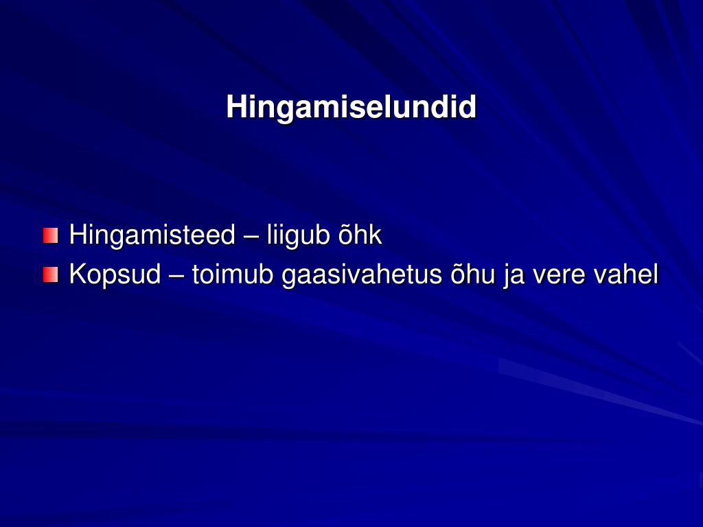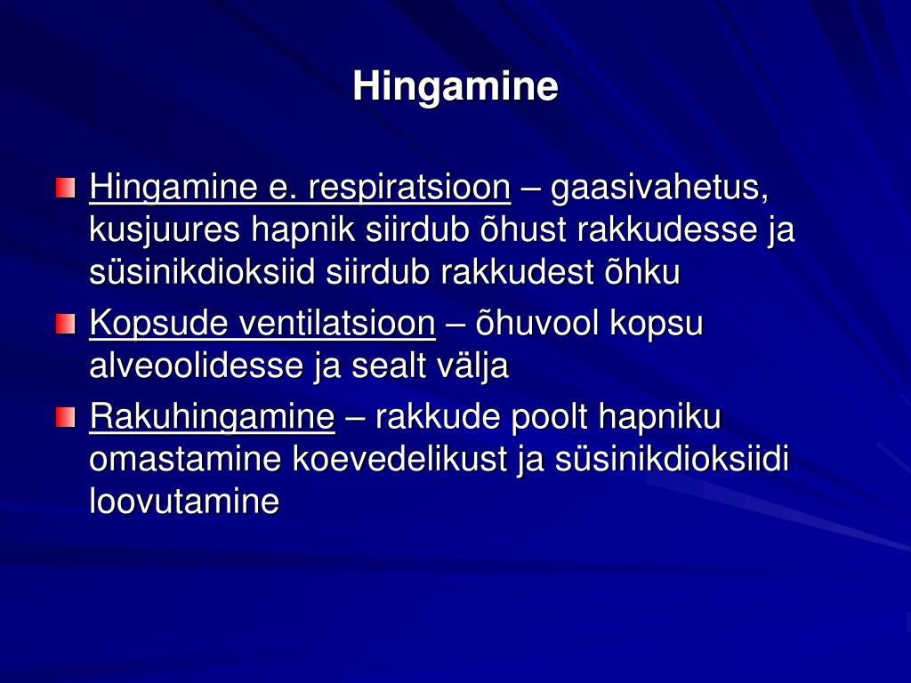 Hingamine • Hingamine e. respiratsioon – gaasivahetus, kusjuures hapnik siirdub õhust rakkudesse ja süsinikdioksiid siirdub rakkudest õhku • Kopsude ventilatsioon – õhuvool kopsu alveoolidesse ja sealt välja • Rakuhingamine – rakkude poolt hapniku omastamine koevedelikust ja süsinikdioksiidi loovutamine