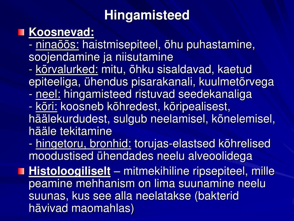 Hingamisteed • Koosnevad: - ninaõõs: haistmisepiteel, õhu puhastamine, soojendamine ja niisutamine - kõrvalurked: mitu, õhku sisaldavad, kaetud epiteeliga, ühendus pisarakanali, kuulmetõrvega - neel: hingamisteed ristuvad seedekanaliga - kõri: koosneb kõhredest, kõripealisest, häälekurdudest, sulgub neelamisel, kõnelemisel, hääle tekitamine - hingetoru, bronhid: torujas-elastsed kõhrelised moodustised ühendades neelu alveoolidega • Histoloogiliselt – mitmekihiline ripsepiteel, mille peamine mehhanism on lima suunamine neelu suunas, kus see alla neelatakse (bakterid hävivad maomahlas)