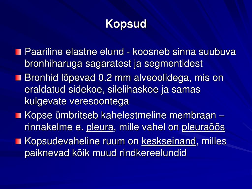 Kopsud • Paariline elastne elund - koosneb sinna suubuva bronhiharuga sagaratest ja segmentidest • Bronhid lõpevad 0.2 mm alveoolidega, mis on eraldatud sidekoe, silelihaskoe ja samas kulgevate veresoontega • Kopse ümbritseb kahelestmeline membraan – rinnakelme e. pleura, mille vahel on pleuraõõs • Kopsudevaheline ruum on keskseinand, milles paiknevad kõik muud rindkereelundid