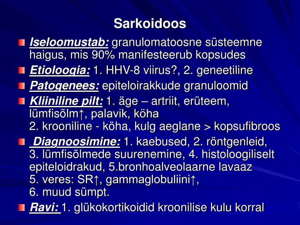 Sarkoidoos • Iseloomustab: granulomatoosne süsteemne haigus, mis 90% manifesteerub kopsudes • Etioloogia: 1. HHV-8 viirus?, 2. geneetiline • Patogenees: epiteloirakkude granuloomid • Kliiniline pilt: 1. äge – artriit, erüteem, lümfisõlm↑, palavik, köha 2. krooniline - köha, kulg aeglane > kopsufibroos • Diagnoosimine: 1. kaebused, 2. röntgenleid, 3. lümfisõlmede suurenemine, 4. histoloogiliselt epiteloidrakud, 5.bronhoalveolaarne lavaaz 5. veres: SR↑, gammaglobuliini↑, 6. muud sümpt. • Ravi: 1. glükokortikoidid kroonilise kulu korral