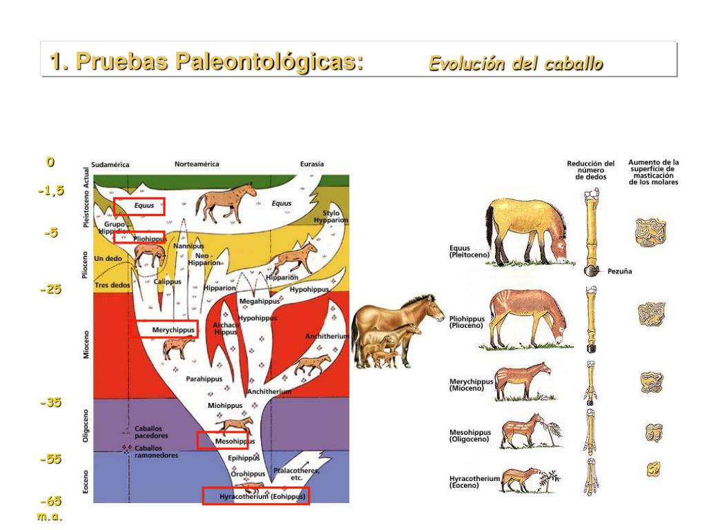 1. Pruebas Paleontológicas: Evolución del caballo 0 -1,5 -5 -25 -35 -55 -65 m.a.