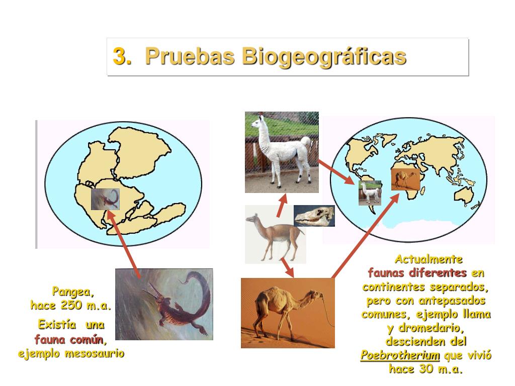 3. Pruebas Biogeográficas Actualmente faunas diferentes en continentes separados, pero con antepasados comunes, ejemplo llama y dromedario, descienden del Poebrotherium que vivió hace 30 m.a. Pangea, hace 250 m.a. Existía una fauna común, ejemplo mesosaurio