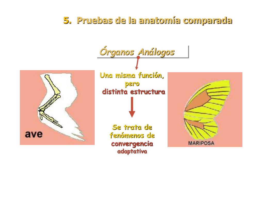 5. Pruebas de la anatomía comparada Órganos Análogos Una misma función, pero distinta estructura Se trata de fenómenos de convergencia adaptativa