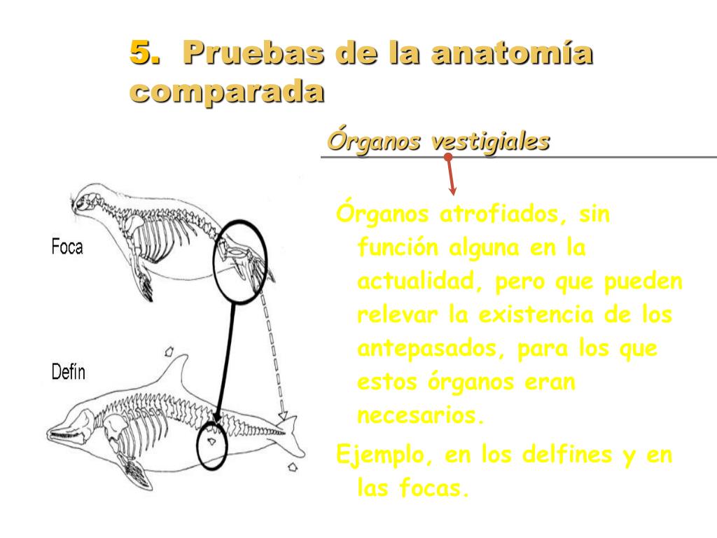 5. Pruebas de la anatomía comparada Órganos vestigiales Órganos atrofiados, sin función alguna en la actualidad, pero que pueden relevar la existencia de los antepasados, para los que estos órganos eran necesarios. Ejemplo, en los delfines y en las focas.