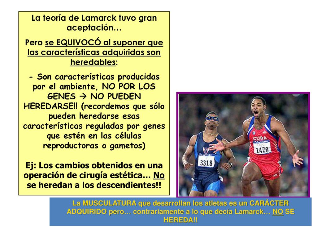 La teoría de Lamarck tuvo gran aceptación… Pero se EQUIVOCÓ al suponer que las características adquiridas son heredables: - Son características producidas por el ambiente, NO POR LOS GENES NO PUEDEN HEREDARSE!! (recordemos que sólo pueden heredarse esas características reguladas por genes que estén en las células reproductoras o gametos)Ej: Los cambios obtenidos en una operación de cirugía estética… No se heredan a los descendientes!! La MUSCULATURA que desarrollan los atletas es un CARÁCTER ADQUIRIDO pero… contrariamente a lo que decía Lamarck… NO SE HEREDA!!