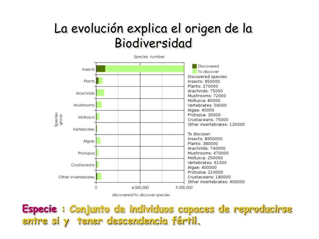 La evolución explica el origen de la Biodiversidad Especie : Conjunto de individuos capaces de reproducirse entre si y tener descendencia fértil.