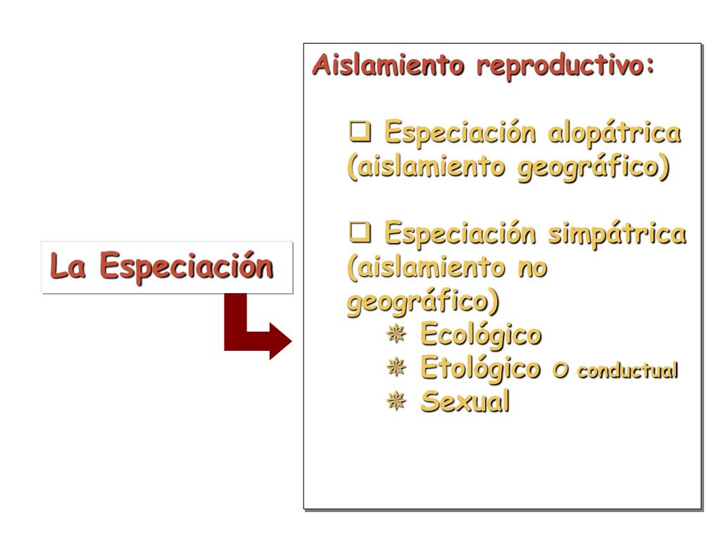 Aislamiento reproductivo: • Especiación alopátrica (aislamiento geográfico) • Especiación simpátrica (aislamiento no geográfico) • Ecológico • Etológico O conductual • Sexual La Especiación