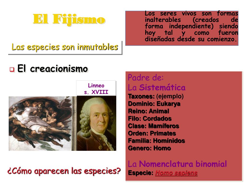 El Fijismo Los seres vivos son formas inalterables (creados de forma independiente) siendo hoy tal y como fueron diseñadas desde su comienzo. Las especies son inmutables • El creacionismo Padre de: La Sistemática Taxones: (ejemplo) Dominio: Eukarya Reino: Animal Filo: Cordados Clase: Mamíferos Orden: Primates Familia: Homínidos Genero: Homo La Nomenclaturabinomial Especie: Homo sapiens Linneo s. XVIII ¿Cómo aparecen las especies?
