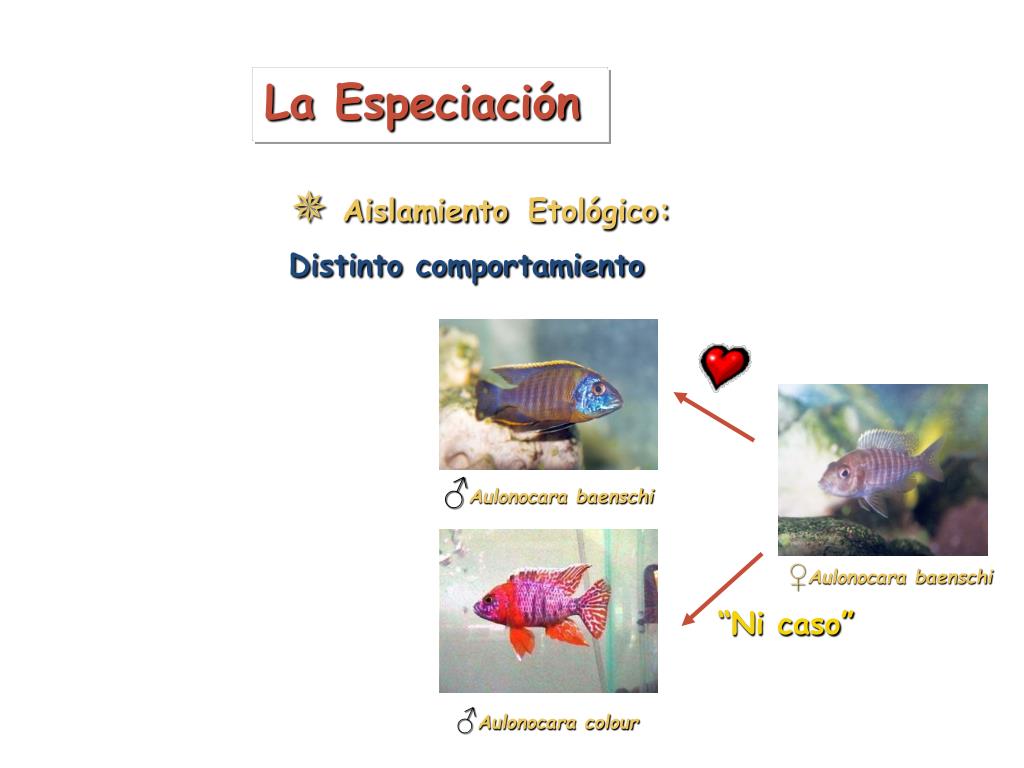 La Especiación • AislamientoEtológico: • Distinto comportamiento • Aulonocara baenschi • Aulonocara baenschi “Ni caso” • Aulonocara colour