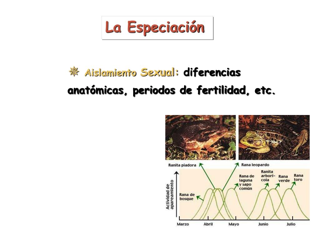 La Especiación • Aislamiento Sexual: diferencias anatómicas, periodos de fertilidad, etc.
