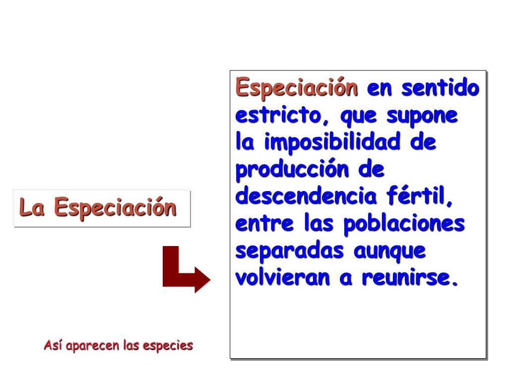 Especiaciónen sentido estricto, que supone la imposibilidad de producción de descendencia fértil, entre las poblaciones separadas aunque volvieran a reunirse. La Especiación Así aparecen las especies