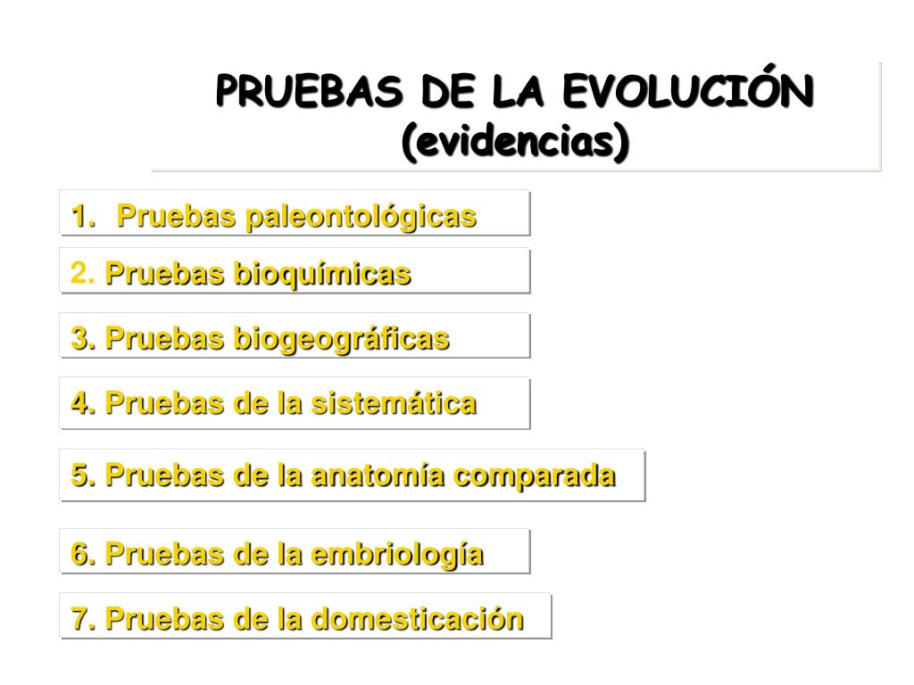 PRUEBAS DE LA EVOLUCIÓN (evidencias) Pruebas paleontológicas 2. Pruebas bioquímicas 3. Pruebas biogeográficas 4. Pruebas de la sistemática 5. Pruebas de la anatomía comparada 6. Pruebas de la embriología 7. Pruebas de la domesticación