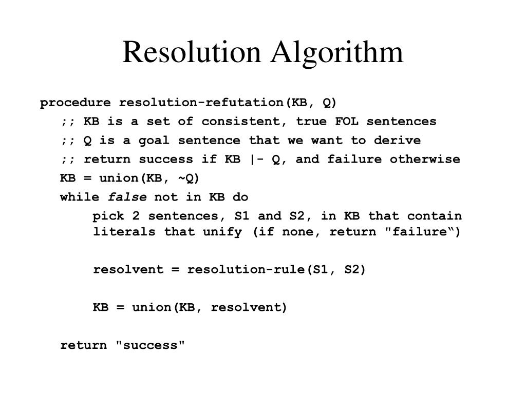 Resolution Algorithm procedure resolution-refutation(KB, Q) ;; KB is a set of consistent, true FOL sentences ;; Q is a goal sentence that we want to derive ;; return success if KB |- Q, and failure otherwise KB = union(KB, ~Q) while false not in KB do pick 2 sentences, S1 and S2, in KB that contain literals that unify (if none, return "failure“) resolvent = resolution-rule(S1, S2) KB = union(KB, resolvent) return "success"